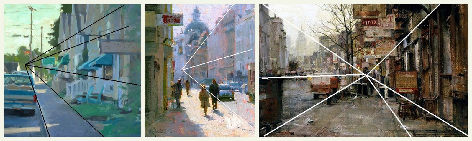 Colin Page, Jennifer McChristian, and Richard Schmid (respectively below) each used the convergence to keep the viewer inside the painting, each showing a different variation on where the lines come together, therefore each placing the viewer in a slightly different vantage point.