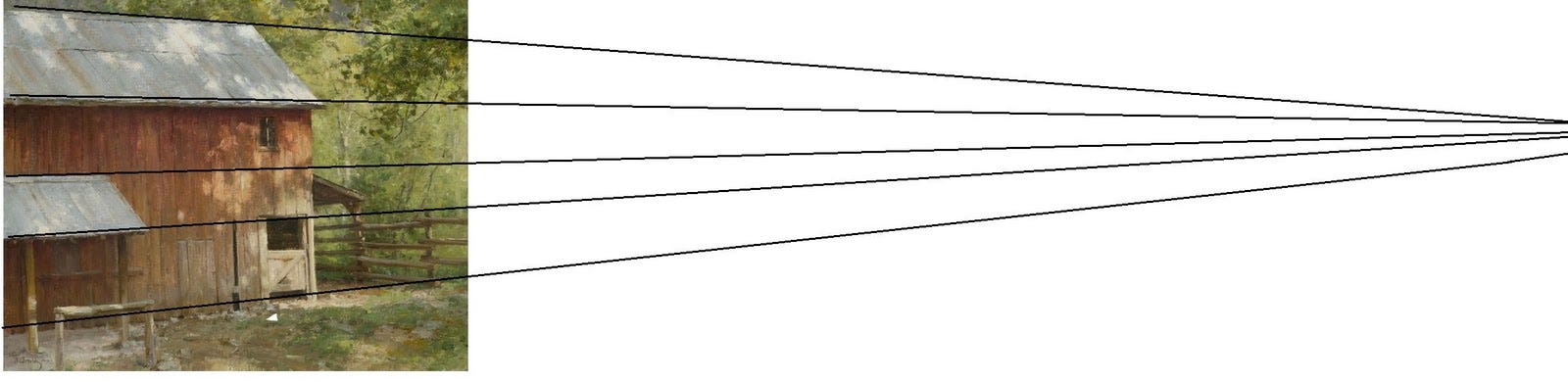 Using converging lines gives both order and dynamics to a painting: order in that shapes are aligned rather than being randomly placed, and dynamics in that converging lines keep the eye moving. Keeping this in mind, the artist need not memorize the rules of perspective.