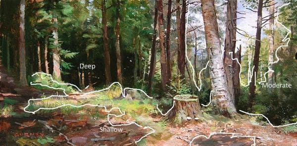 Look at the value, hue, and saturation modulation in Gurney’s moderate and shallow shadows, and how easy our eyes transition from the shallow shadows in the upper tree foliage in light to the deep shadows near the ground.