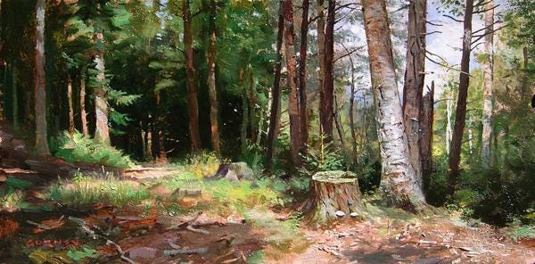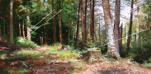 Many emerging painters complain about their values not being “clean” and most are at a loss as to what to do about it. If you’ve never heard this particular term before, having “clean values” is simply artspeak for a painting with convincing colors and strong, visually meaningful values, such as in this little forest scene painting by James Gurney.