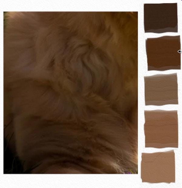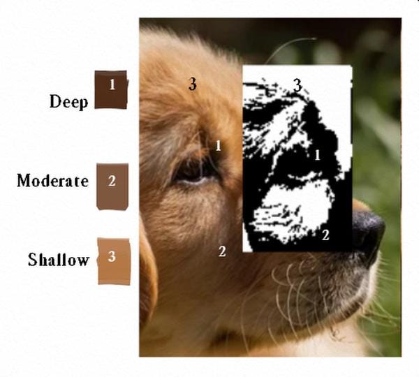 We can group these shadow values and color variations as deep shadow, moderate shadow, and shallow. Notice how their alternation with light creates the details of the dog's eye.